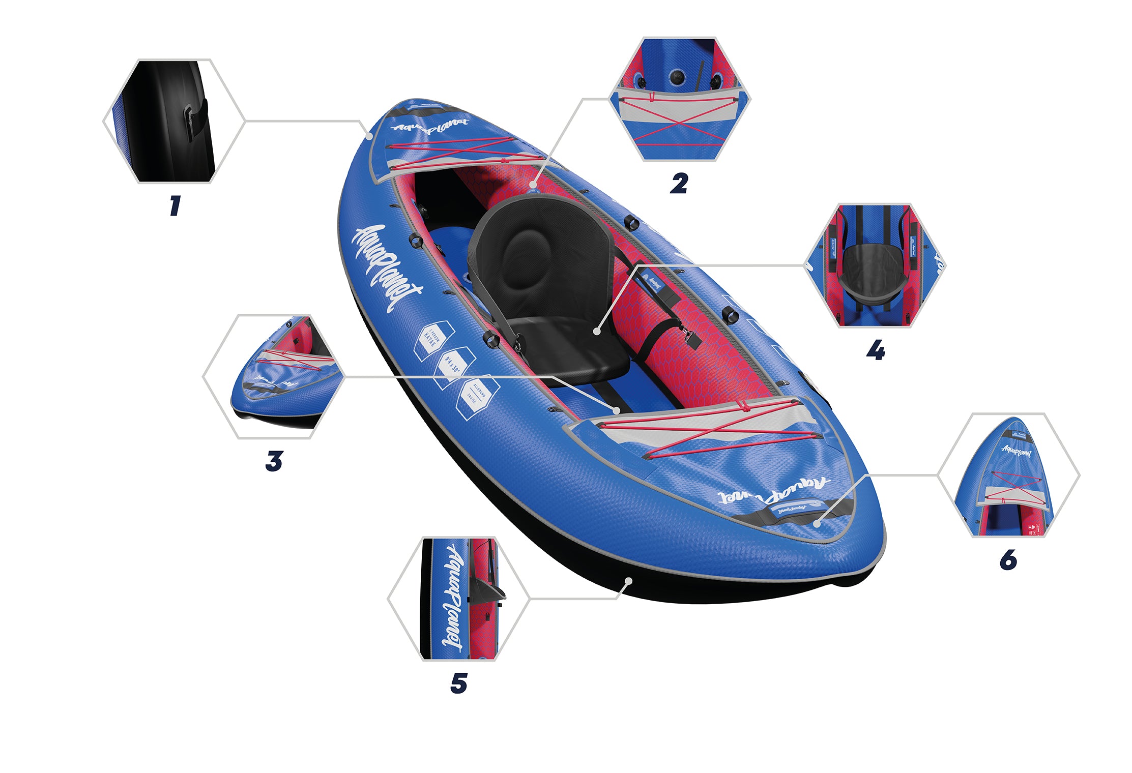 De kajak is gebouwd om lang mee te gaan en heeft een heavy-duty polyester buitenschaal die snel droogt en bestand is tegen ruige omstandigheden. Het ontwerp met drie kamers zorgt voor optimale stijfheid en prestaties.